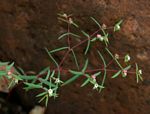 Laxly branched erect annual herb, up to c. 25 cm tall. Branches pinkish red, hairless. Leaves opposite, linear-lanceolate, up to 2.5 cm long, hairless; margin entire. Stipules small but divided into 3-5 linear teeth. Flowers terminal and axillary, solitary, with 4 white or pink, petal-like appendages. Capsule 3-lobed, c. 2.5 mm in diameter, hairless, exserted on a recurved pedicel. See E. eylesii for comparison. |